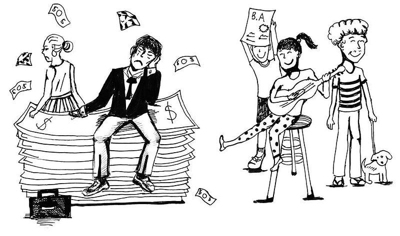 It has been imprinted on us that success equals financial stability, but where does this ideology come from? Living comfortably requires money, therefore, we believe that to improve our lifestyles and be deemed successful, we must acquire an income to support our necessary and excessive purchases. Thus, many parents drive their children to study hard and get high paying jobs.